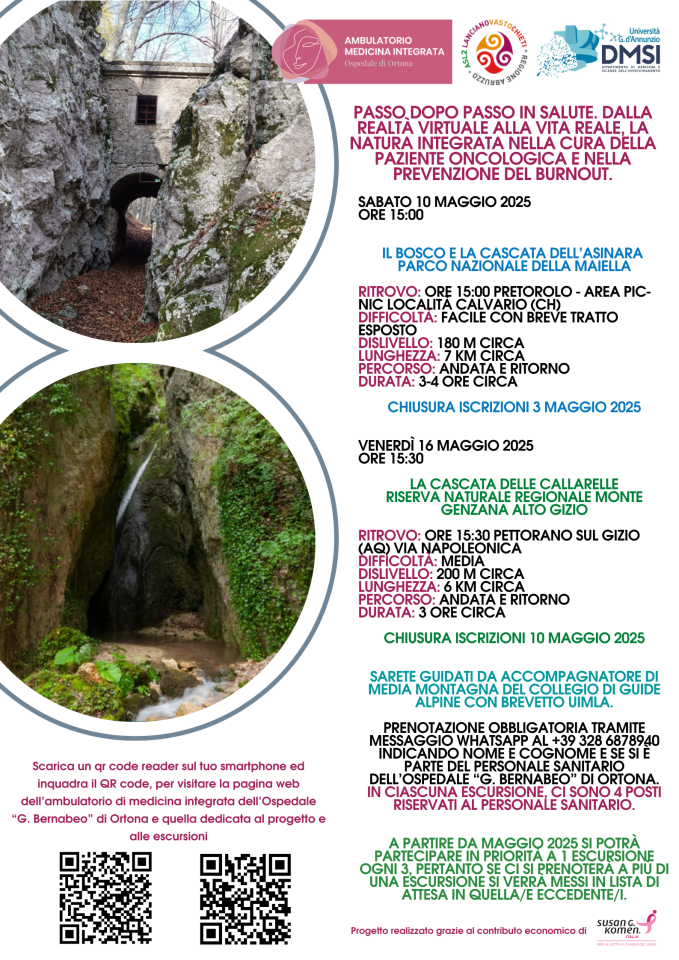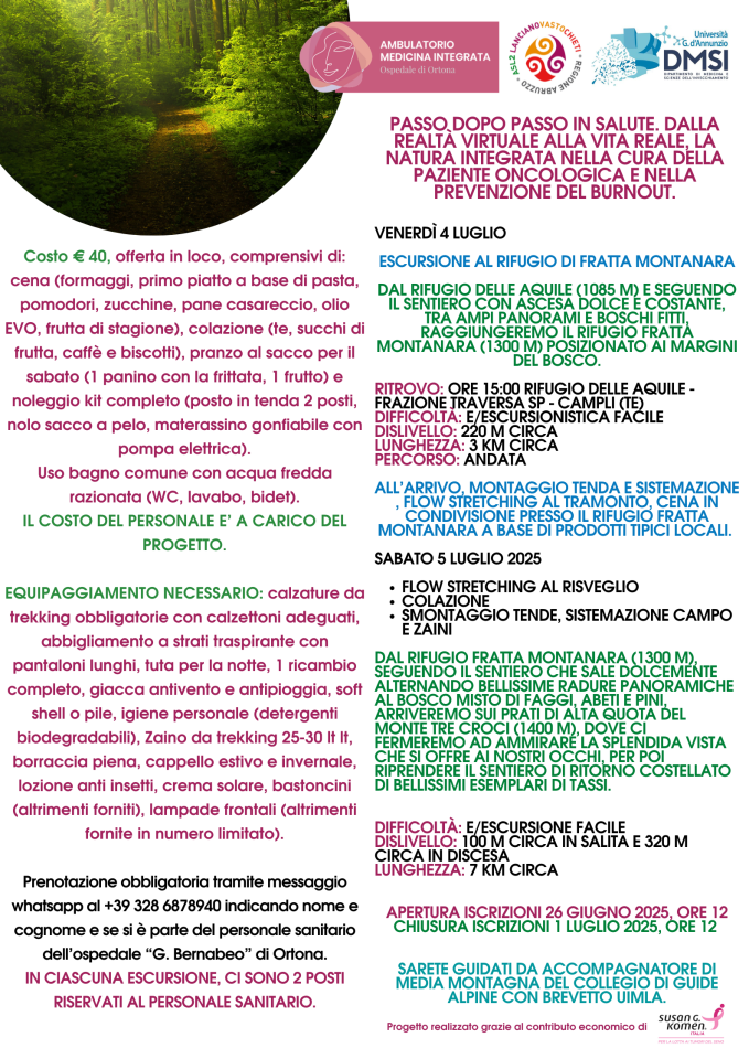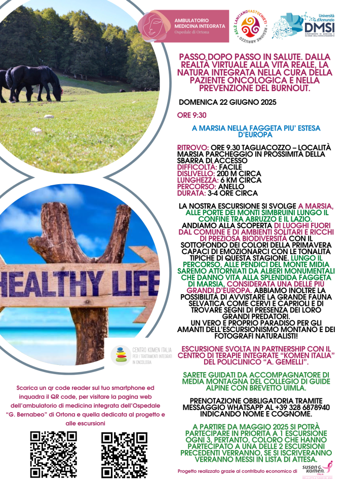 Tale progetto è realizzato grazie al contributo di “Susan G. Komen” Italia ed è svolto in convenzione con la soc. coop. IL BOSSO, per quel che riguarda la parte escursionistica, che prevede anche la partecipazione dello staff dell’AMBULATORIO DI MEDICINA INTEGRATA, al fine di cementare ulteriormente il legame con la paziente ma anche di beneficiare in maniera diretta degli effetti psicofisici della natura, attraverso l’immersione sia virtuale, sia reale.